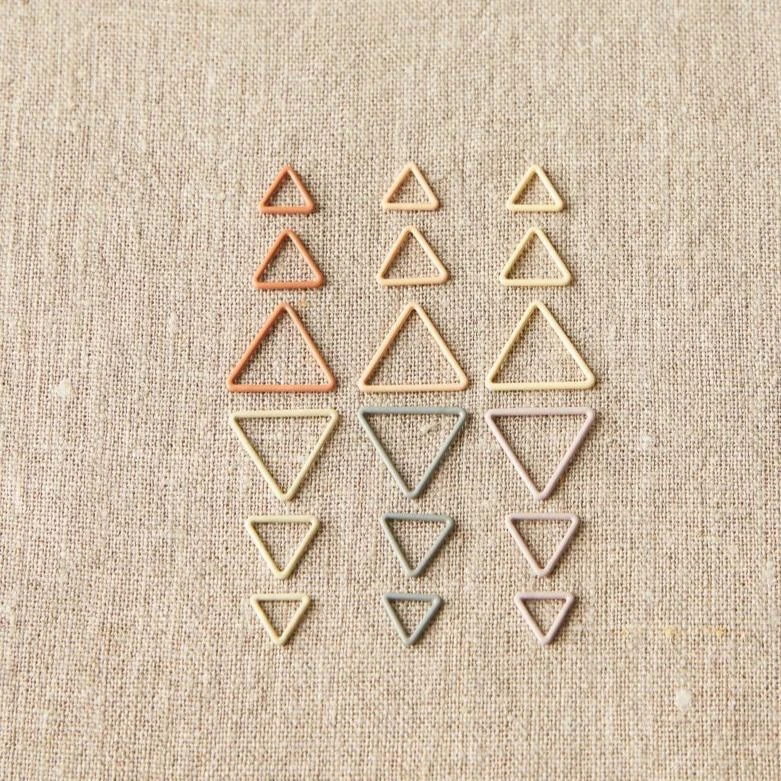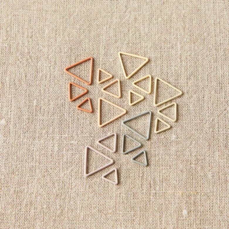 Cocoknits Triangle Stitch Markers come in a triangle-shaped kraft box with a removable top and contain 54 markers in total.