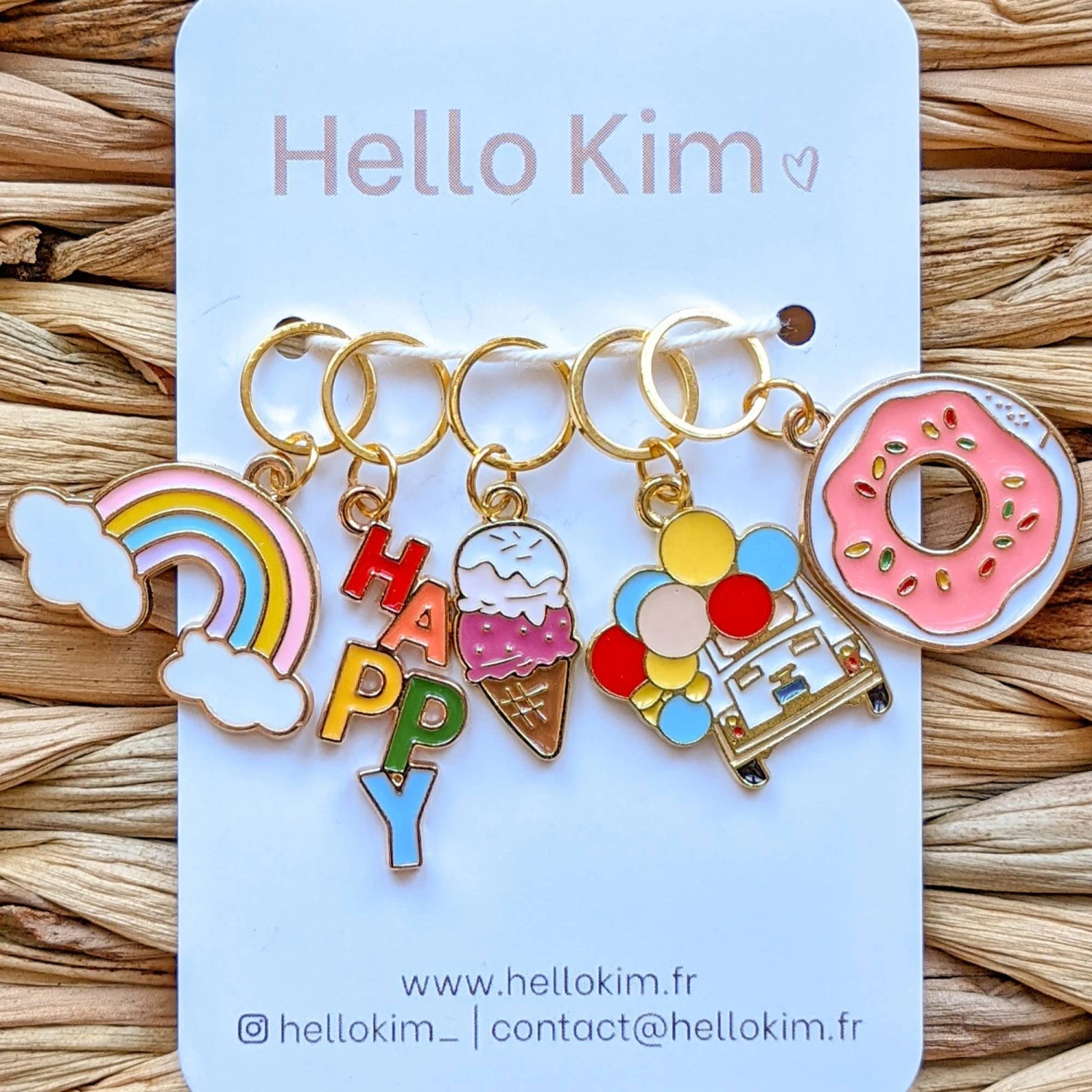 From Hello Kim, the Happy Stitch Marker Set includes five marker rings.