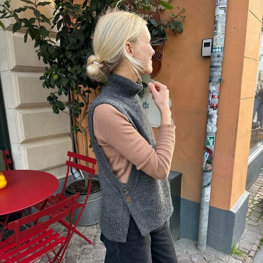 The Lulu Slipover is worked from the top down. The slipover has a deep armhole and is closed with two summarys along both sides. First, the back is worked and then the front. Ribbing edges are worked along the armholes, and along the sides, which form slits towards the hem, double knitted edges are worked. Two summaryholes are worked along the front part of these double knitted edges. At the end, a ribbing edge is worked along the neck opening.