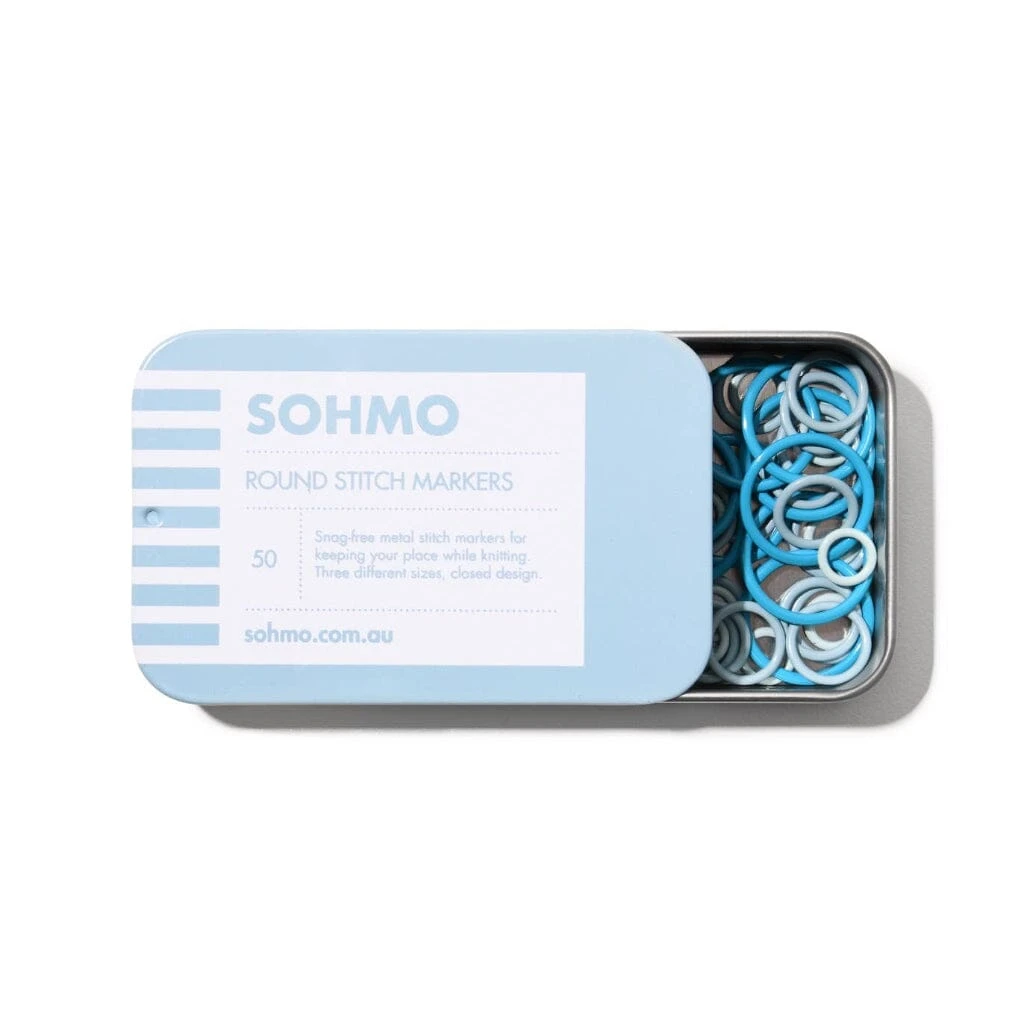 Each tin contains 50 closed ring markers in three different sizes, all in soft, coordinating shades of blue. Whether you’re working with laceweight or chunky yarn, there’s a size to suit your project.